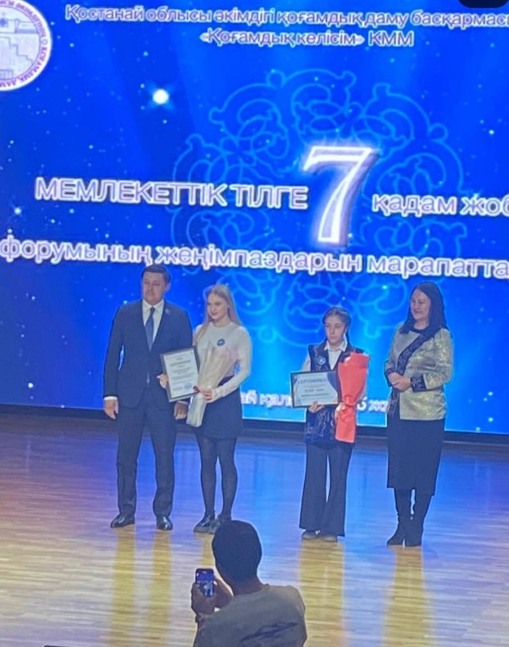 Среди участников мероприятия достойно представила свою школу ученица 11 «Б» класса Щербаковской школы им.М. Хакимжановой Ребро Алена. На протяжении всего проекта Алена, демонстрируя высокие результаты в изучении казахского языка, проходила специальные занятия и успешно выполняла задания своего куратора.